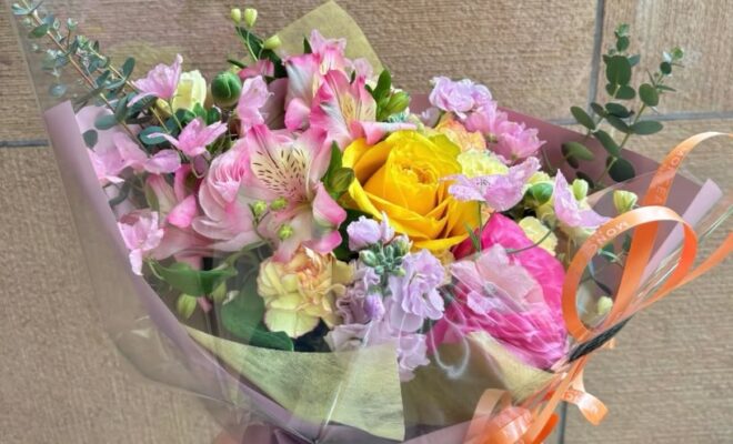 アルストロメリアやストックなど、1本でもボリュームのあるお花を使ってふんわりおまとめしました💐
