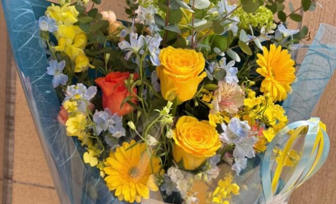 お客様のご希望でユーカリをやデルフィニウムを入れて、明るく爽やかさのあるお花束に仕上げました💐🌙