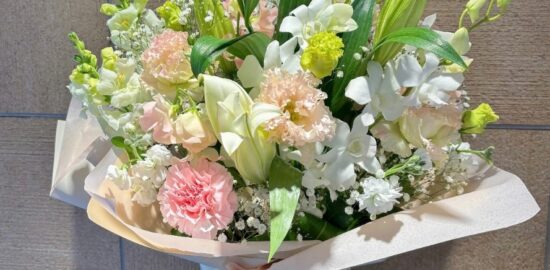 ホワイトと淡いピンクのお供え用アレンジメント 💐プレゼントやお祝い、お供えなどお客様…